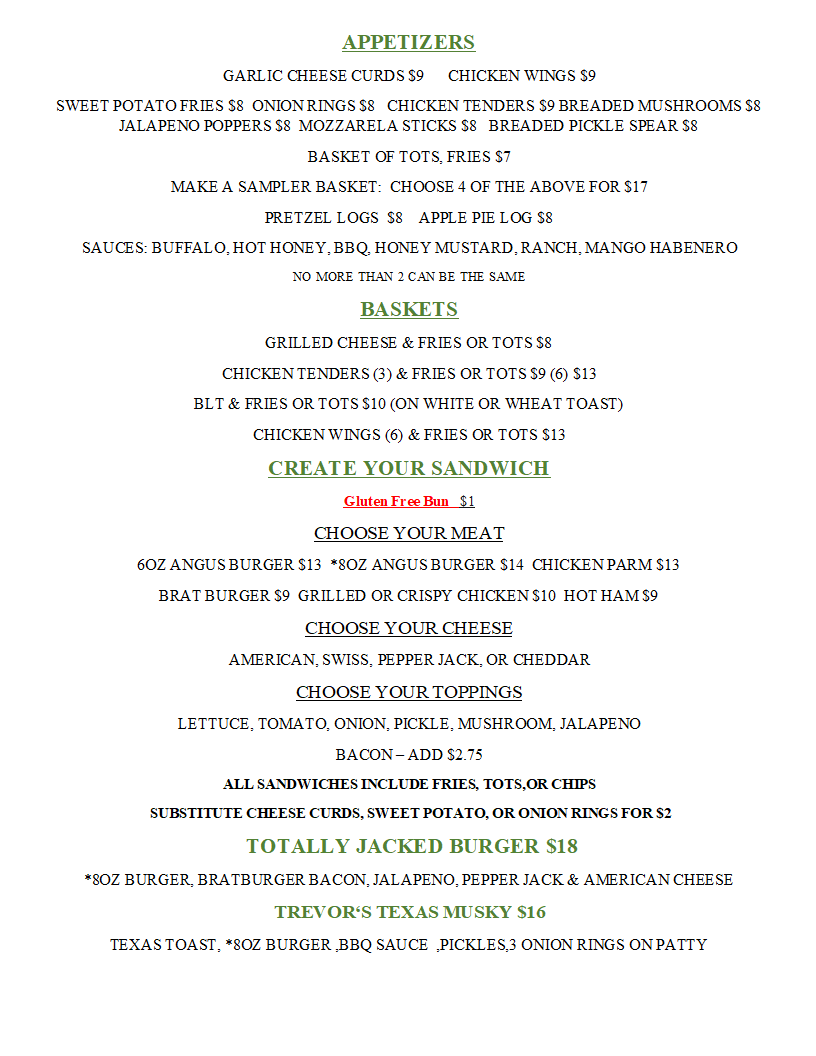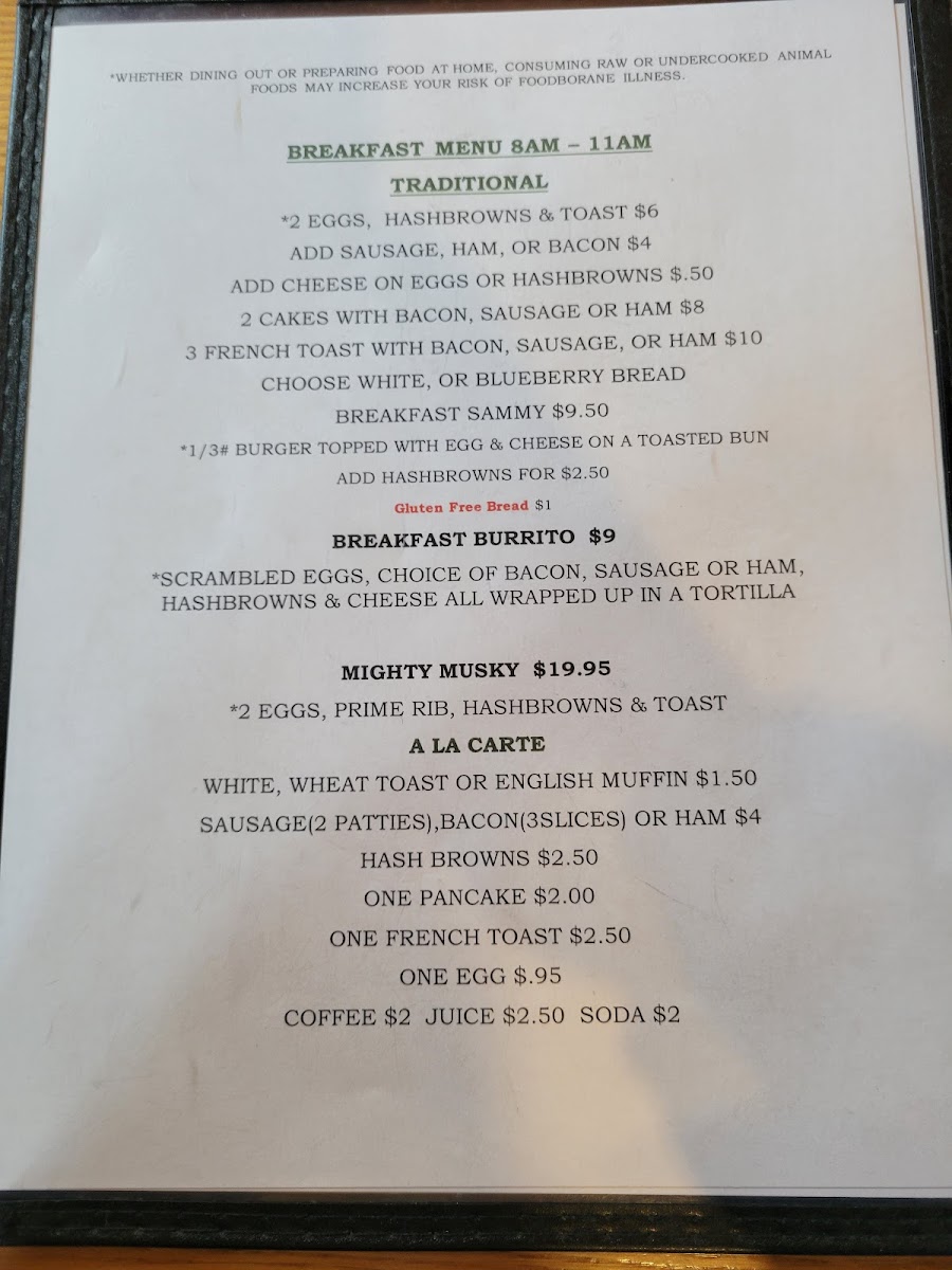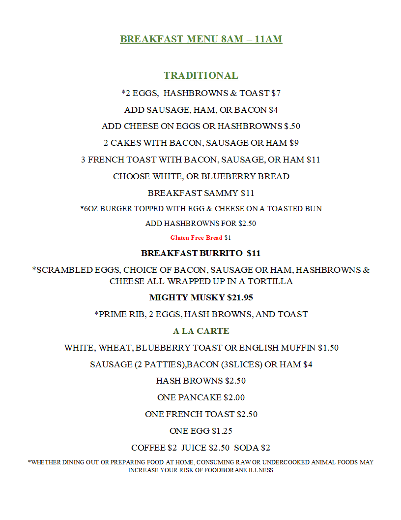 Musky Jack's Bar and Grill offers a cozy and satisfying breakfast menu with a range of a la carte options and hearty combinations. For a simple yet fulfilling meal, you can choose from Hash Browns, One Pancake, One French Toast, or One Egg, each available individually. If you're in the mood for something more substantial, the 2 Cakes with Bacon, Sausage, or Ham and the 3 French Toast with Bacon, Sausage, or Ham are great choices to start your day. For those seeking a savory option, the Breakfast Sammy and Breakfast Burrito offer a delicious combination of flavors to fuel your morning. If you're feeling adventurous, try the Mighty Musky, a standout option for those with a big appetite. Whether you prefer sweet or savory, Musky Jack's provides a variety of breakfast dishes that cater to all tastes.